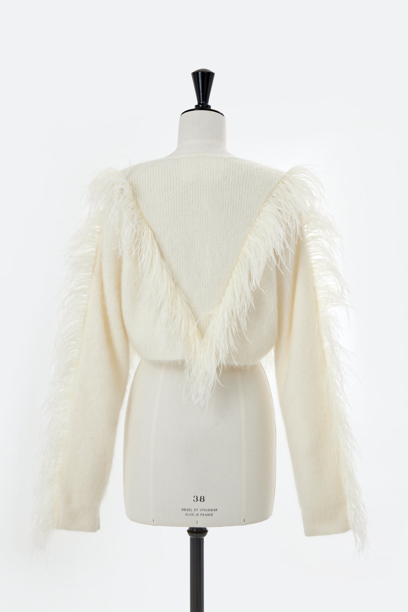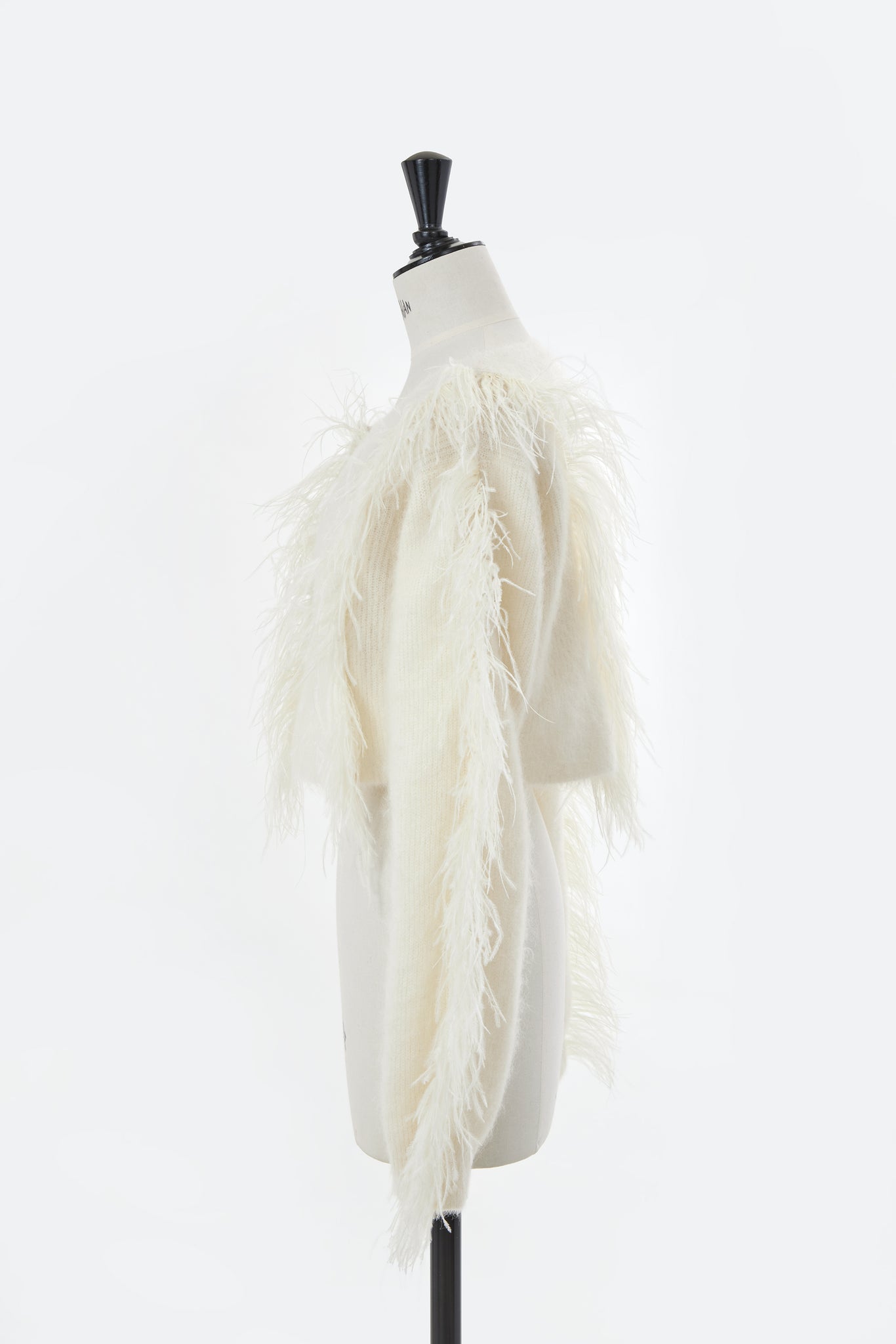 フワフワとした肌触りと優しいムードに癒される、モヘアニットのシリーズ。なかでも、前立て部分とスリーブの側面に繊細なフェザーを手作業であしらった、究極にリュクスな逸品が完成しました。歩くたびにひらひらとゆれるフェザーが華やかな存在感を放ちながら、上質なマテリアルが暖かさも着心地の軽やかさも叶えてくれる才色兼備な一着です。また、背中側にもV字状にフェザーが施されているので、後ろ姿まで360°抜かりのないおしゃれを約束してくれます。