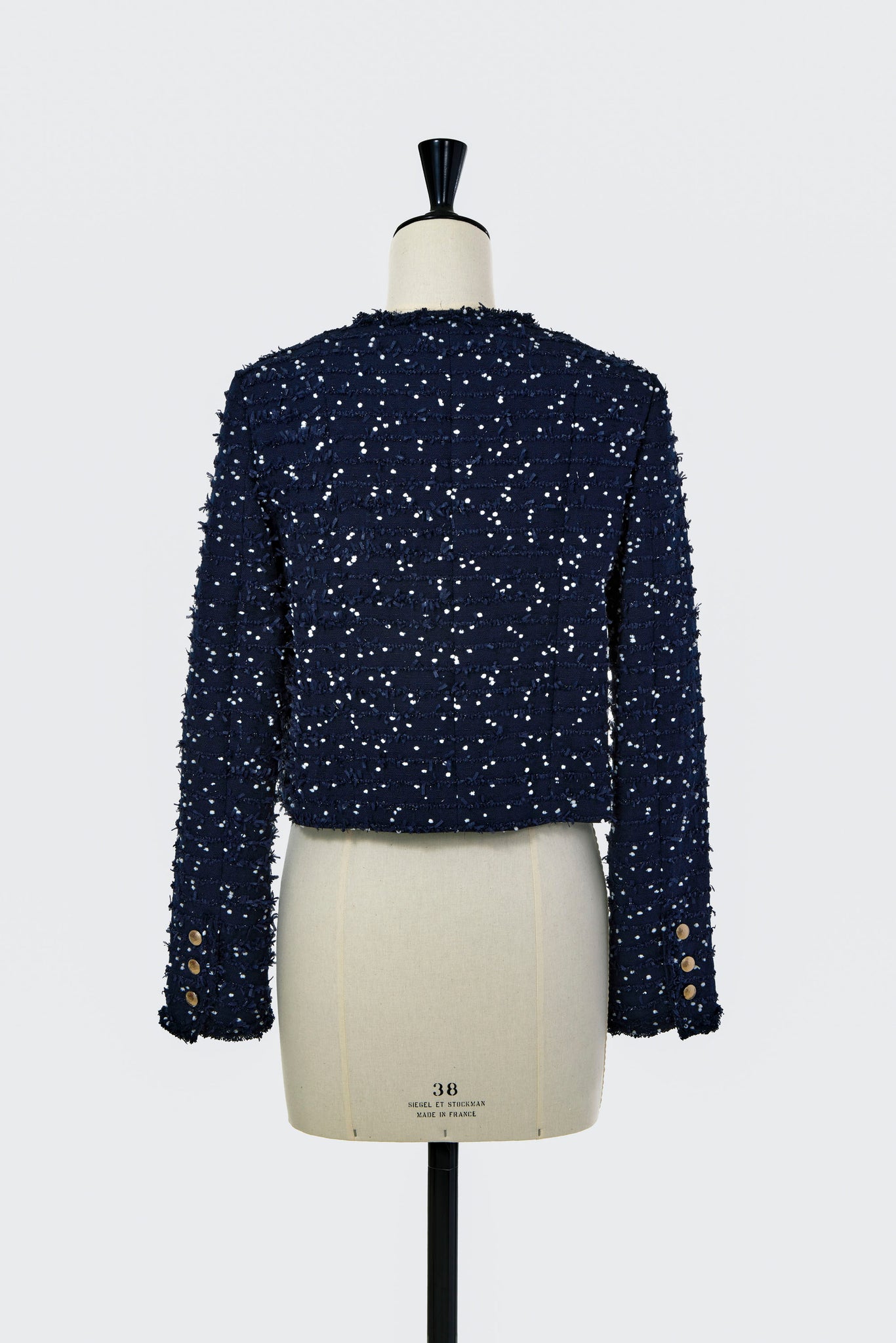 「ネイビー」は、ネイビーのリボンツイードに白のネップを施し、ブラックボタンで引き締めてクールな雰囲気に。