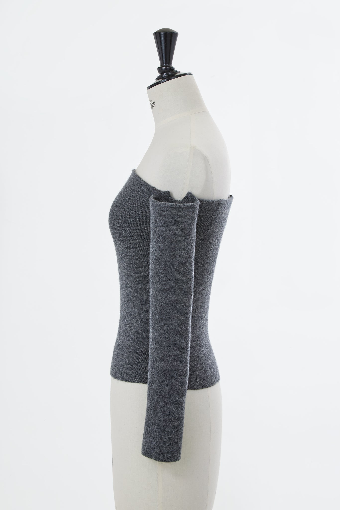 最高級のウールカシミヤを使用した、数シーズンにわたって活躍するオフショルダーニット。