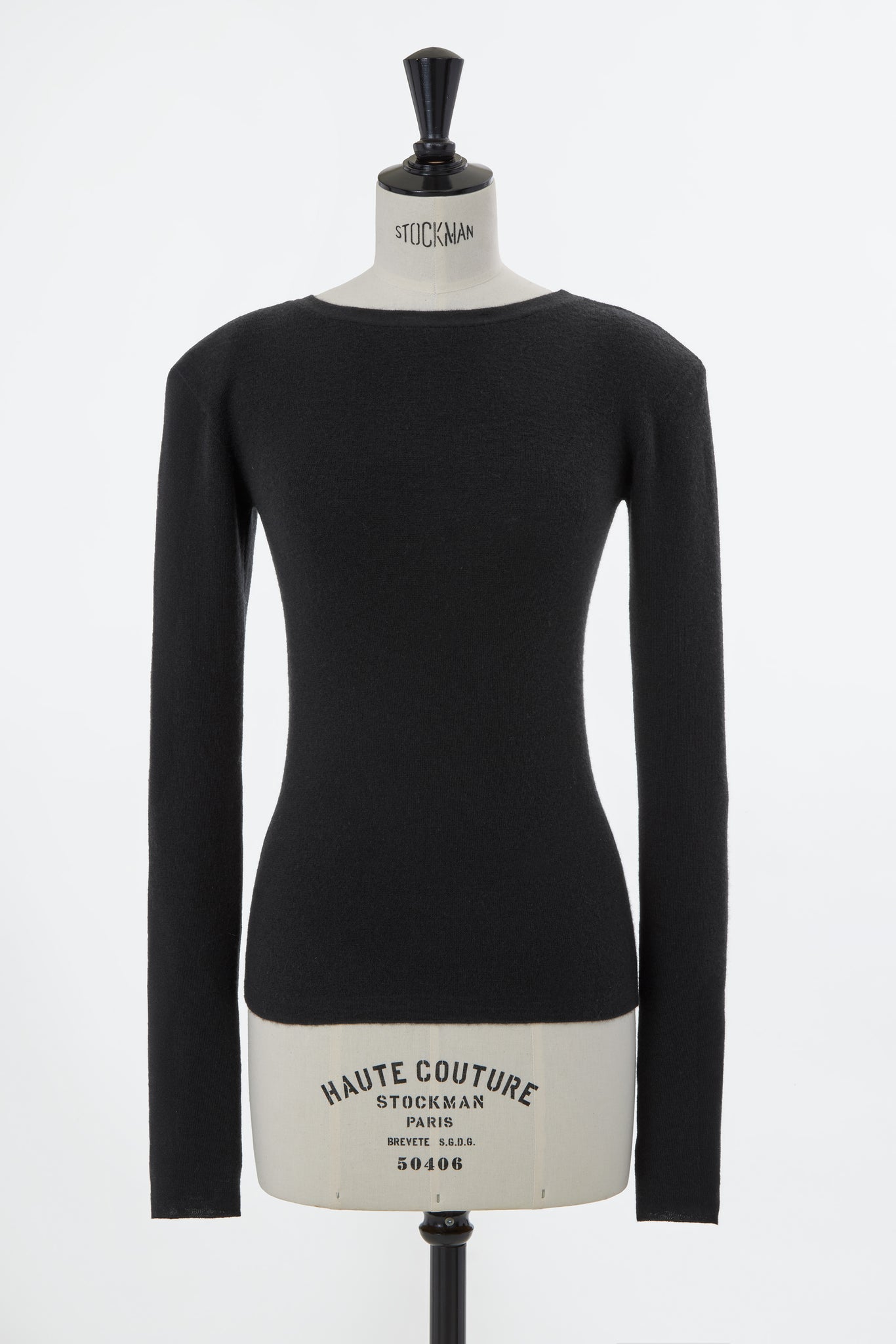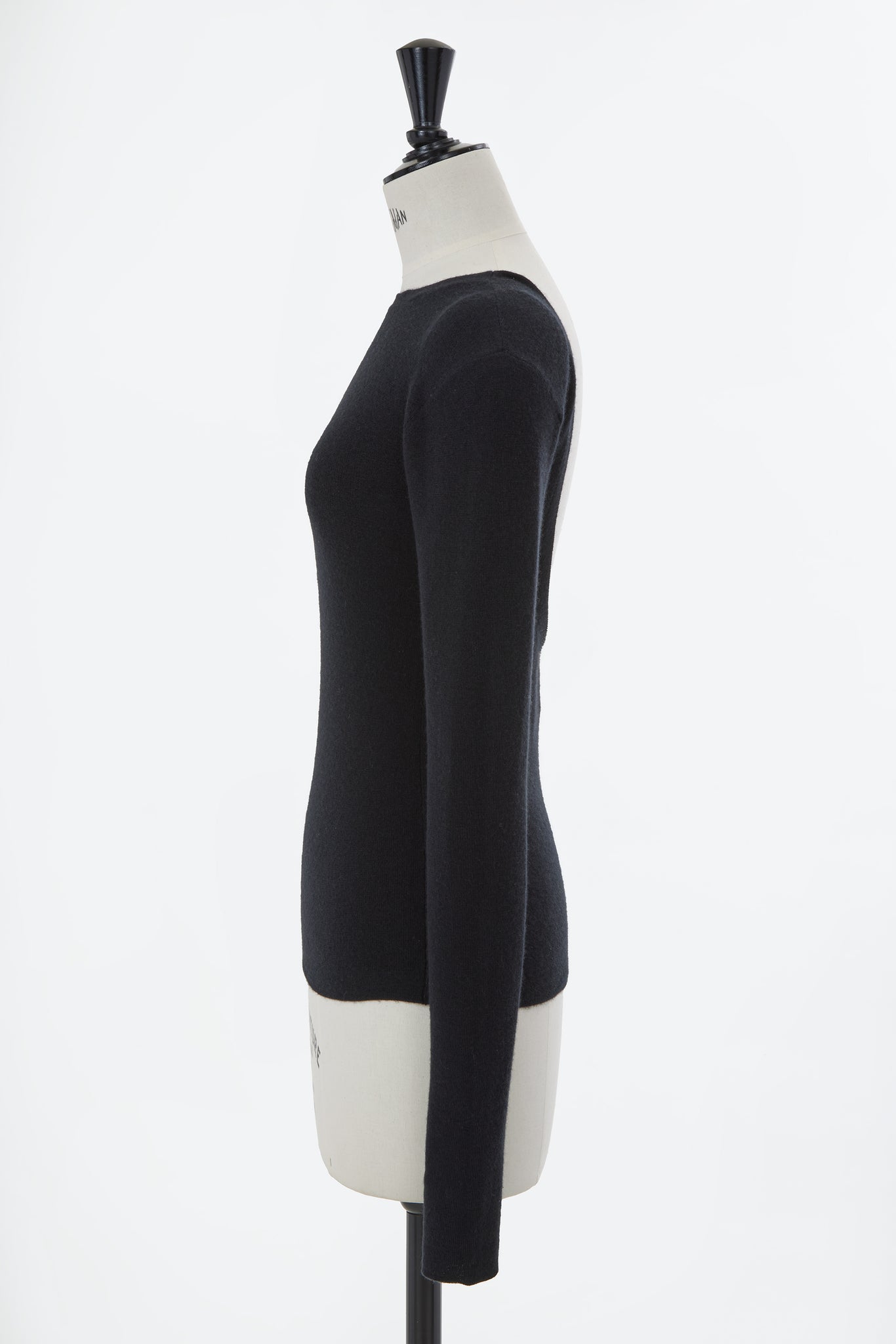 一見ごくプレーンな表情でありながら、肩にやや厚めのパッドをあしらったパワーショルダーが、さりげないモード感を薫らせるニット。背中側に施された、腰上まで大胆に肌見せするU字型の開きは、振り向いたときに意表をつくような新鮮さと潔いほどのセクシーさを演出します。また、ウエストにややカーブをつけた、ボディラインに優しく寄り添う形は、華奢で女性らしいシルエットを印象づけます。