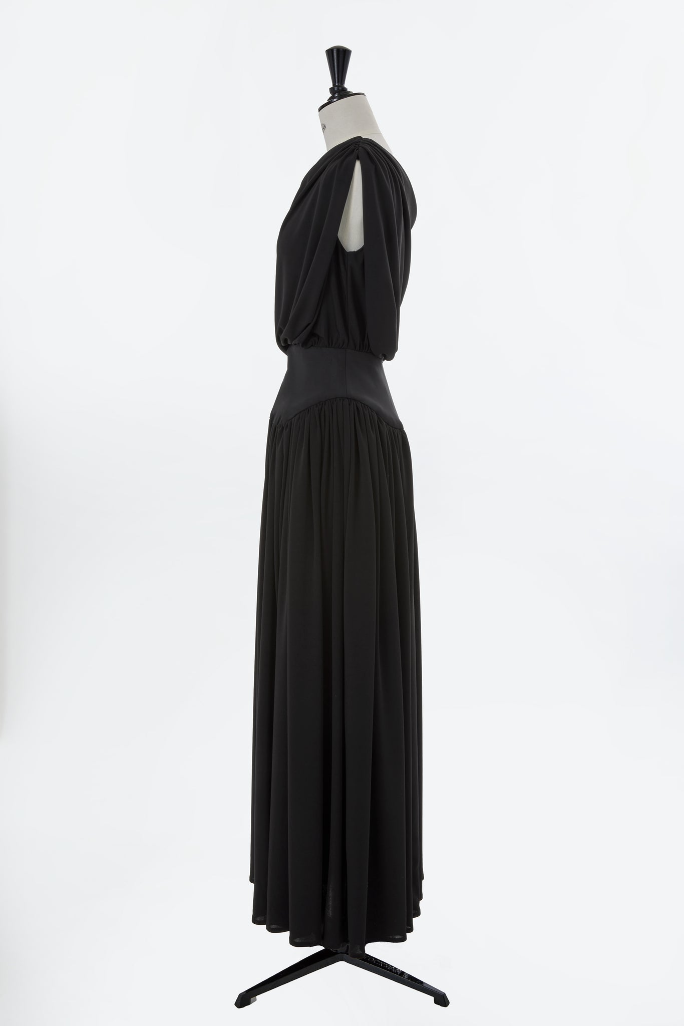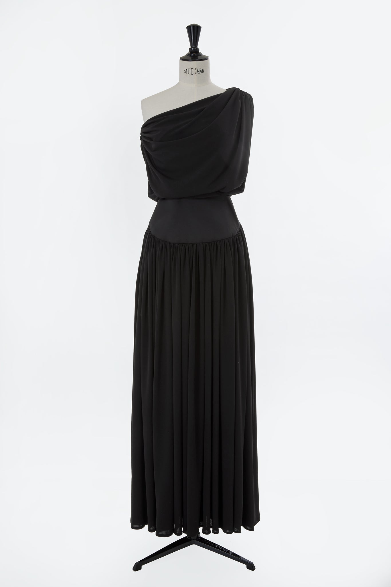 肩を落としてワンショルダーで着用することもでき、華やかさとラフさを自由に演出できるのもポイント。長めの丈で、エレガントな大人のドレススタイルを楽しめる一着です。