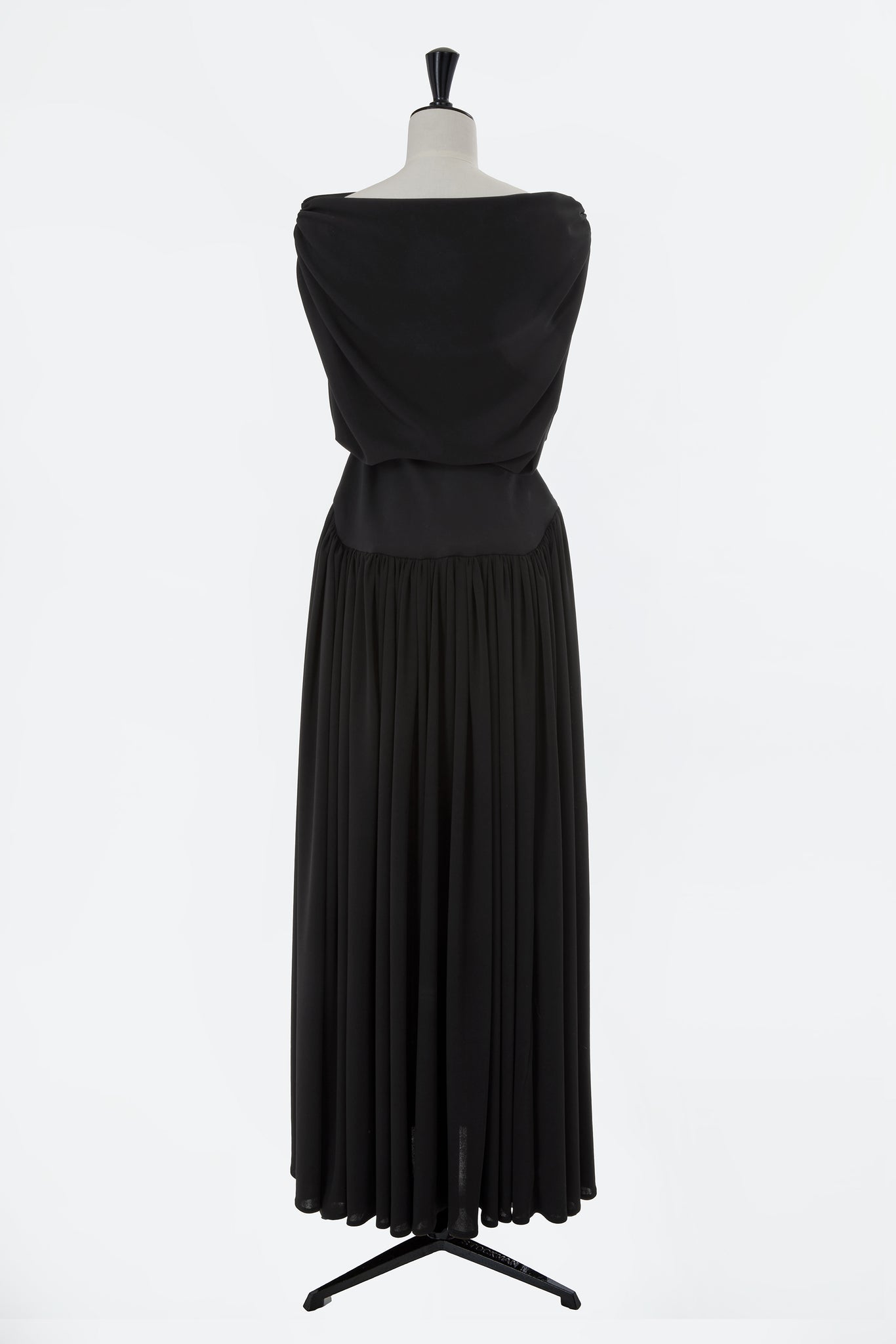 通常の約5倍もの生地をたっぷりと使い、落ち感のある素材が生み出すドレープが美しいシルエットに。ドレスラインは自然と流れを描き、歩くたびにドラマティックなムードを漂わせます。