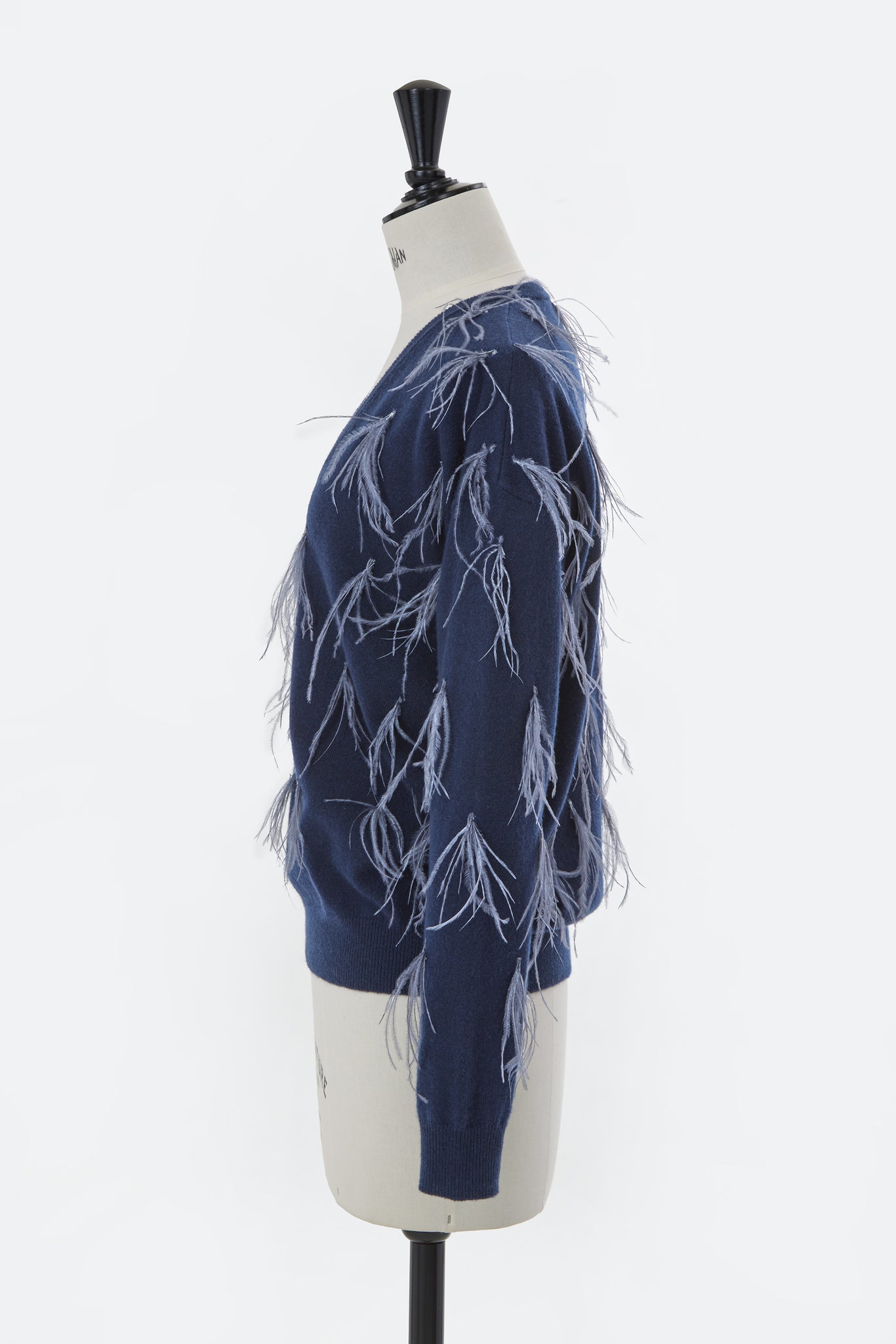 ボディラインにつかず離れずのシルエットが、クリーンな印象を与えるベーシックなVネックニット。そのフロントからバックまで、繊細なフェザーを手作業でふんだんにあしらった贅沢なデザインが、究極にプレミアムなムードを醸し出します。また、鎖骨を美しく見せる上品な首の開きは、重たくなりがちな冬の装いに軽快な抜け感をプラスして、洗練された装いを実現します。