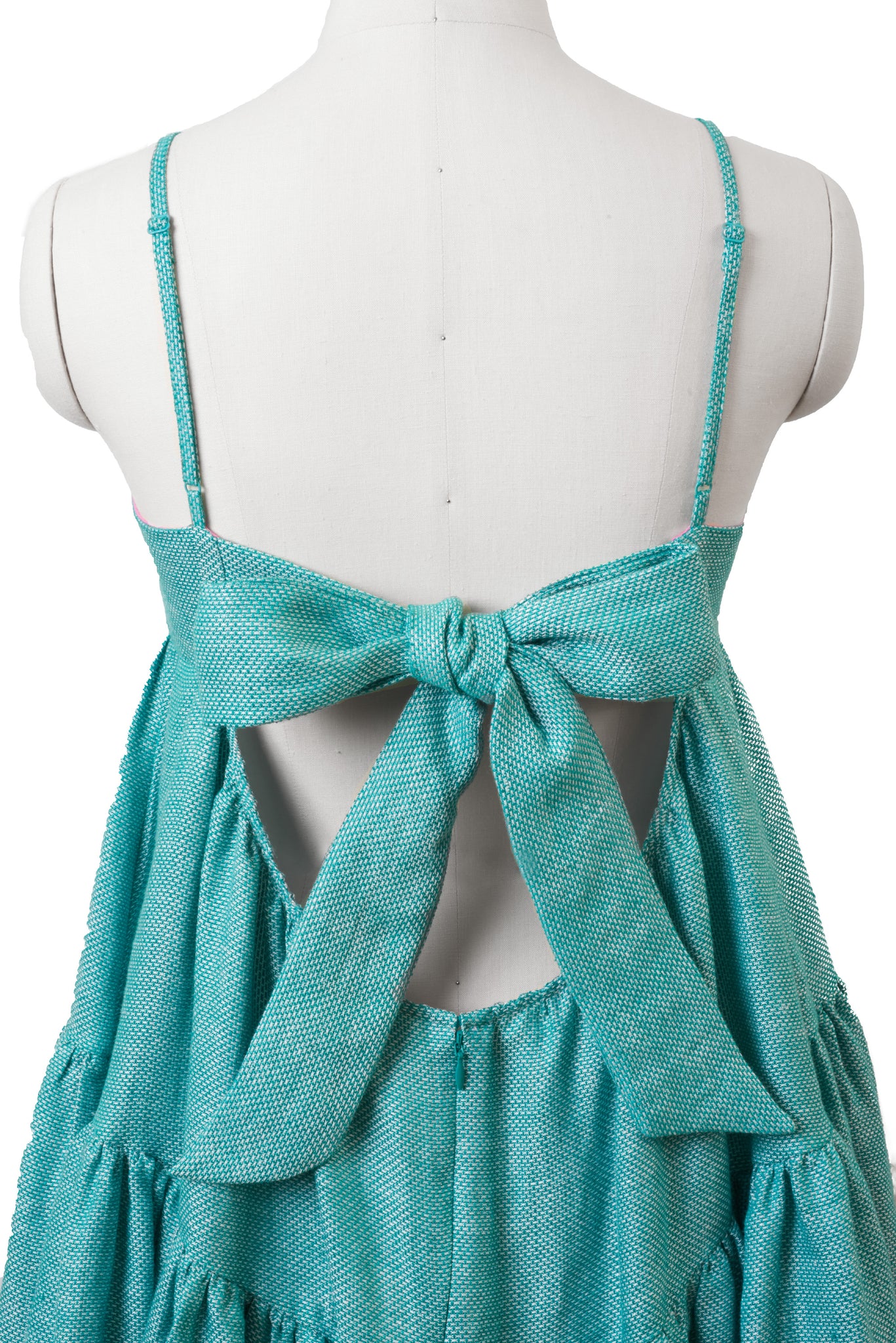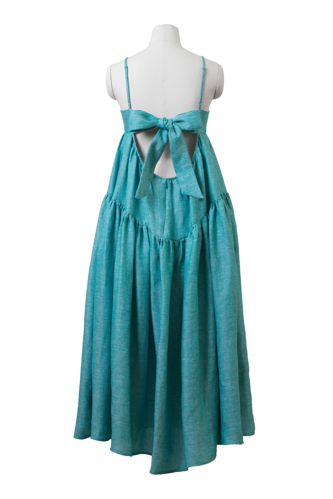とにかく着たときのシルエットが可愛い新作、バックリボンティアードマキシドレス。デビューコレクションから信頼を置きセレクトしているイタリア・パガニーニ社の最高級リネンを贅沢に使い、ギャザーをふんだんに施した3段のティアード、ふんわりとボリュームのあるシルエットはとにかく魅力的。さらに、やや大きくあいた背中部分にはリボンをあしらい、360度どこから見てもチャーミングな仕上がりに。それでいてエレガントなマキシ丈と、上質な素材感が大人の品格もしっかり漂わせる1枚です。パガニーニ社ならではの美しい発色、絶妙な風合い、そしてなにより上質なリネン100%の少し肉厚な生地感、それが肌に触れたときのナチュラルで柔らかい着心地のよさを存分に楽しんでください。ドレスの内側は表面の生地とは異なる色のバイカラーになっており、細部までMYLANらしいカラフルで楽しい気持ちにさせてくれるドレスです。両サイドにポケット付き。