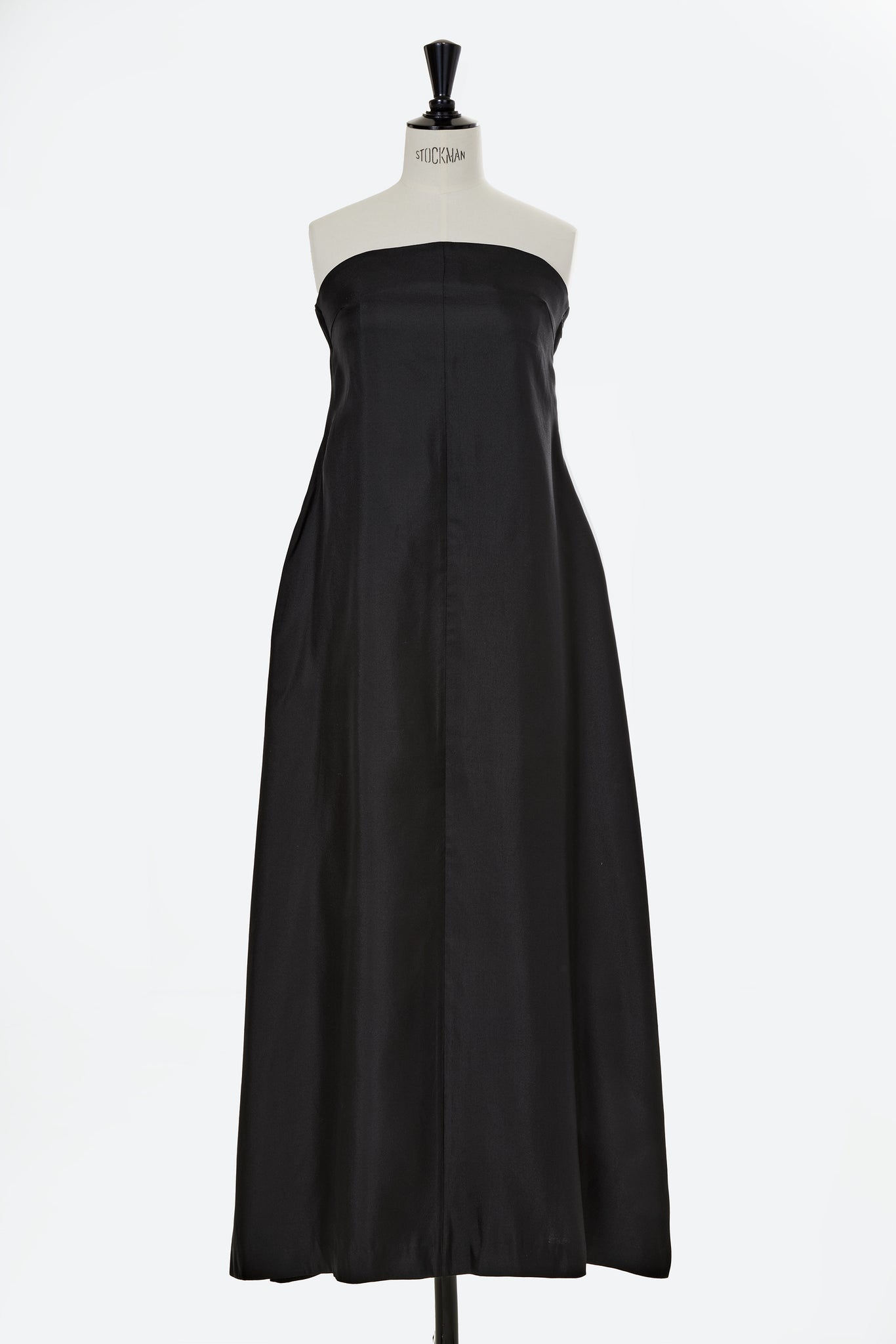 イタリア産シルクを贅沢に使用した、光沢としなやかさが魅力のベアトップドレス。繊細な生地が生み出す美しい落ち感と上質な光沢が、特別なシーンにもふさわしいエレガンスを演出します。